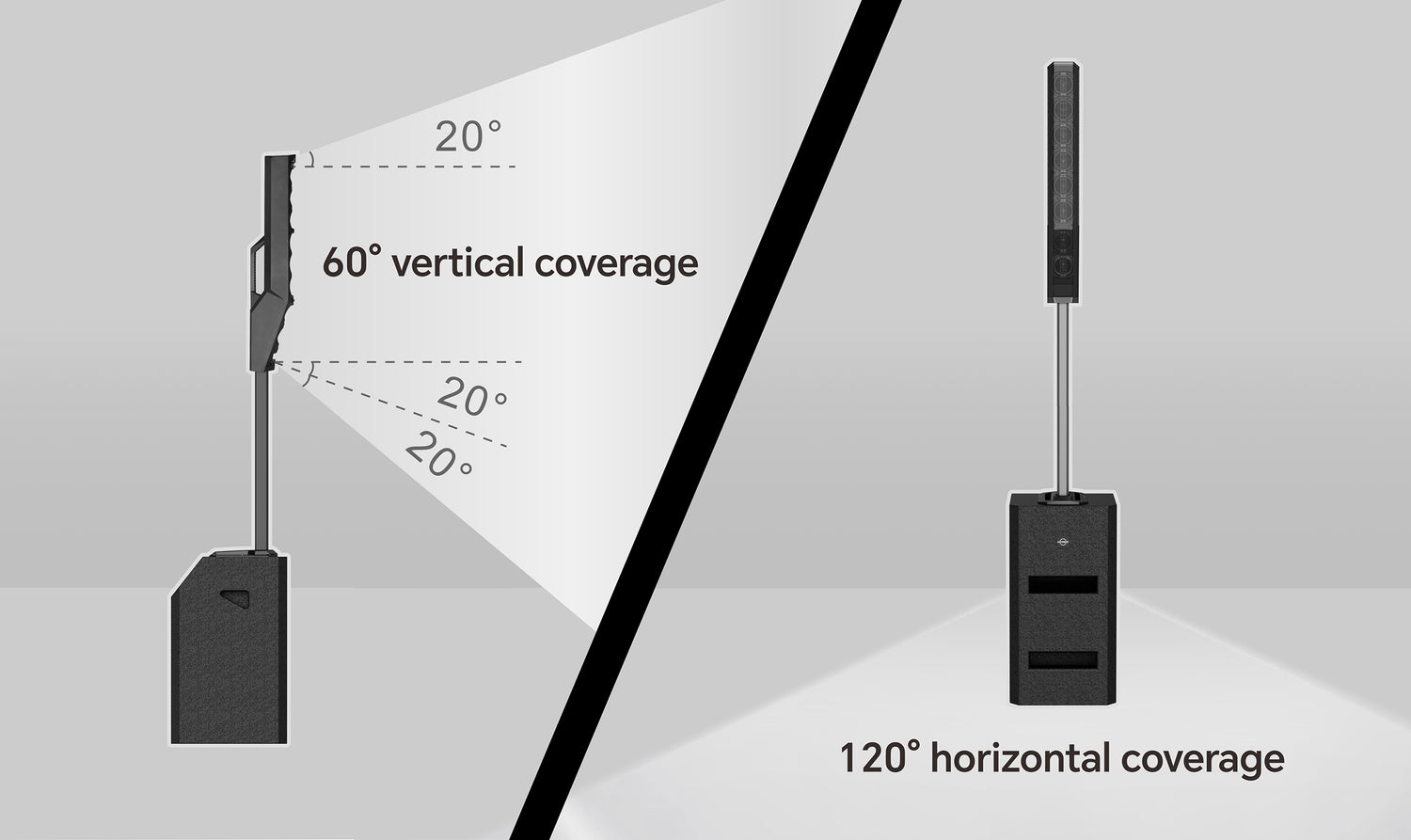 EQ-800 delivers balanced sound that reaches every corner. Equipped with 60° vertical and 120° horizontal dispersion, it maintains clarity and depth whether your audience is seated, standing, or off to the sides in small-to-medium venues—from karaoke rooms to corporate breakout spaces. Its user-friendly design pairs with easy setup: just position it, plug in, and play. Amateur musicians, event DJs, casual entertainers: sound your best without the complexity.