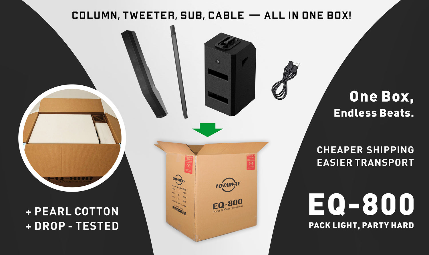 EQ-800’s three-part design fits entirely in one carton: speaker array, subwoofer, power stand, power cord. Pearl cotton protection and drop-test toughness stand up to tours. Compact measurements (18"L × 26"W × 33.6"H) enable easy carrying, no lost accessories. 250 sets per container—ideal for hassle-free shows and fast global deliveries.