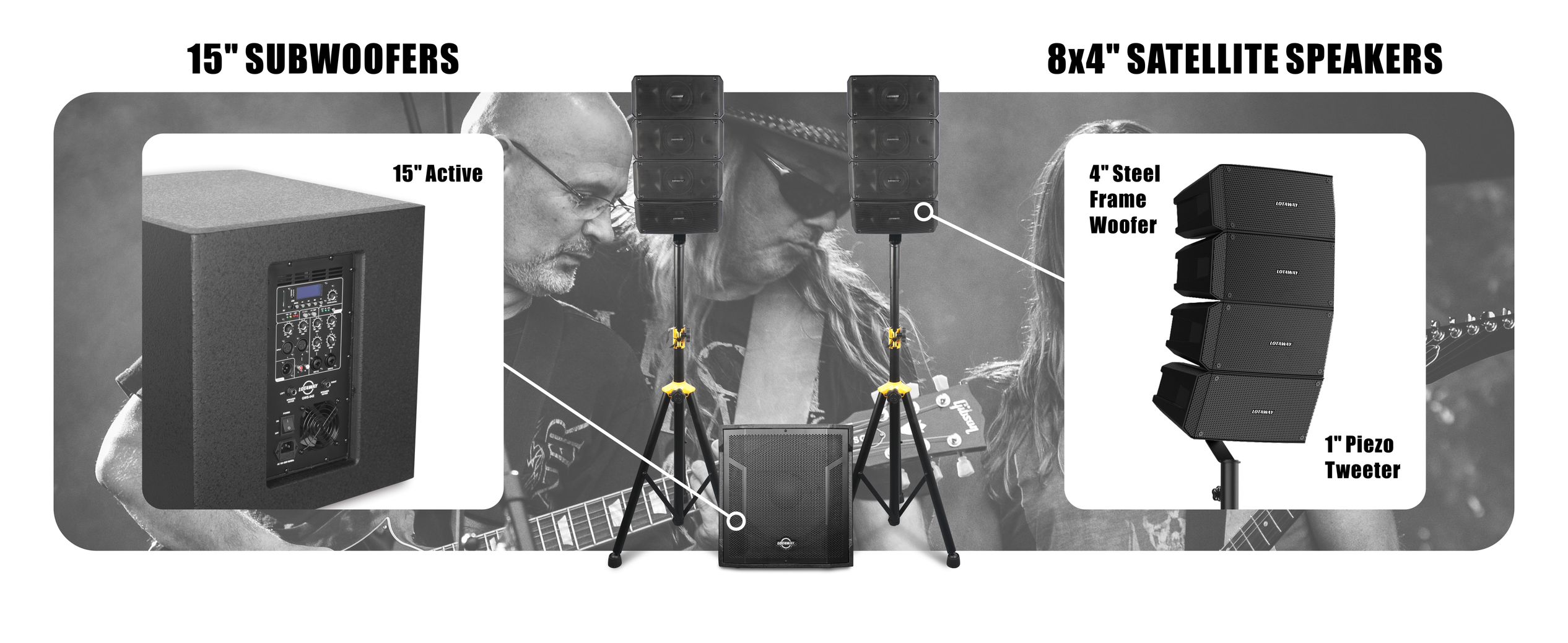 • 2.1 Line Array Setup: 8×4” Steel Woofers + 8×1” Piezo Tweeters + 1×15” (2.5” Voice Coil) Active Subwoofer. Delivers thumping lows and crisp highs with 45Hz-18kHz frequency range – ideal for professional audio live events.
