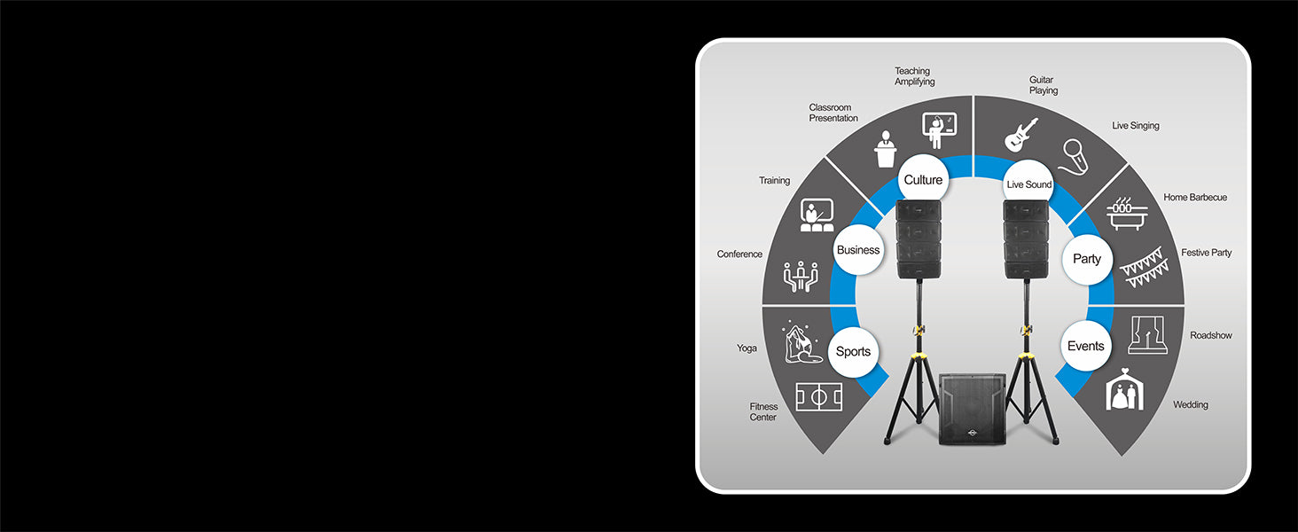 • 720W RMS / 2200W Peak Power + 120dB Max.SPL – fill 400-person indoor venues with immersive clarity.
