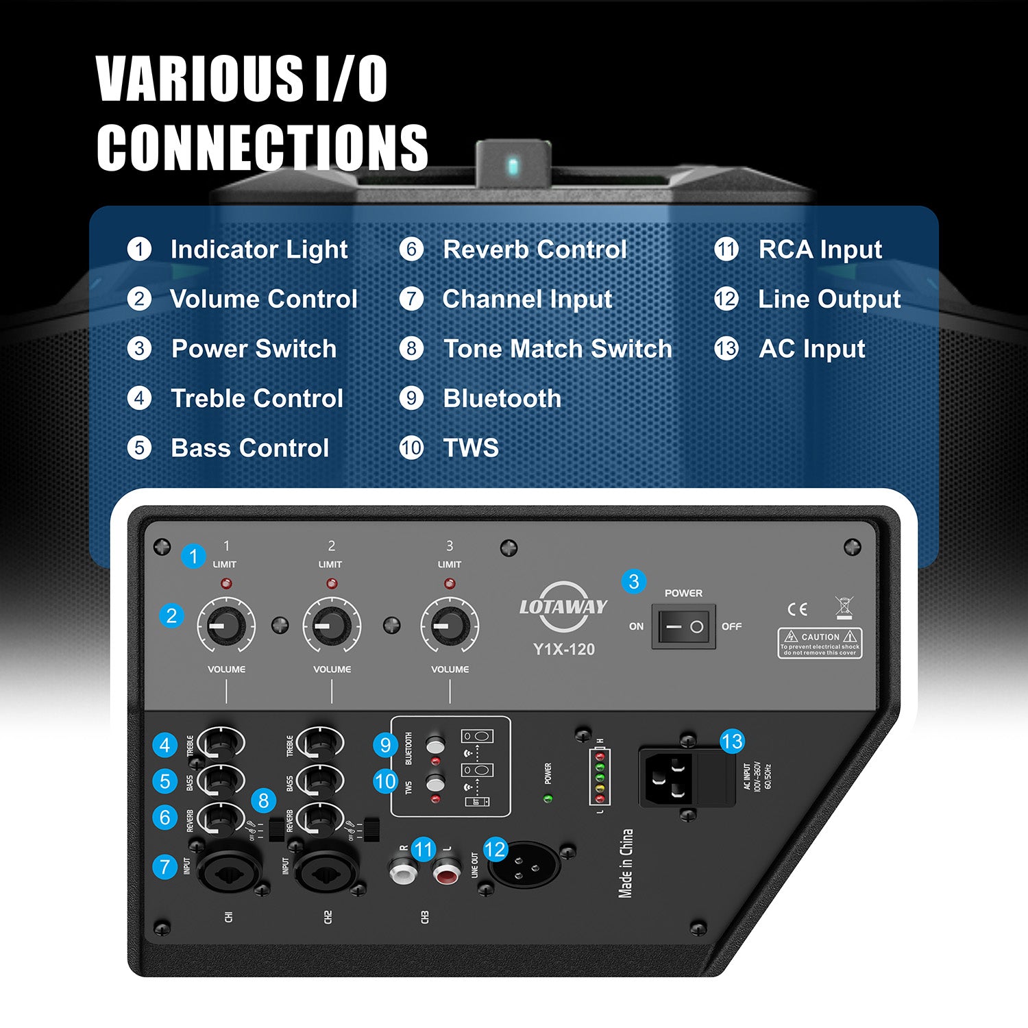 Pro stage speaker LOTAWAY Y1X-120 (3-channel mixer) delivers 60Hz-18kHz sound, 114dB max SPL, and 10m Bluetooth.Compact yet powerful, it fits any scene—one-click stream,blending pro performance and ease of use.