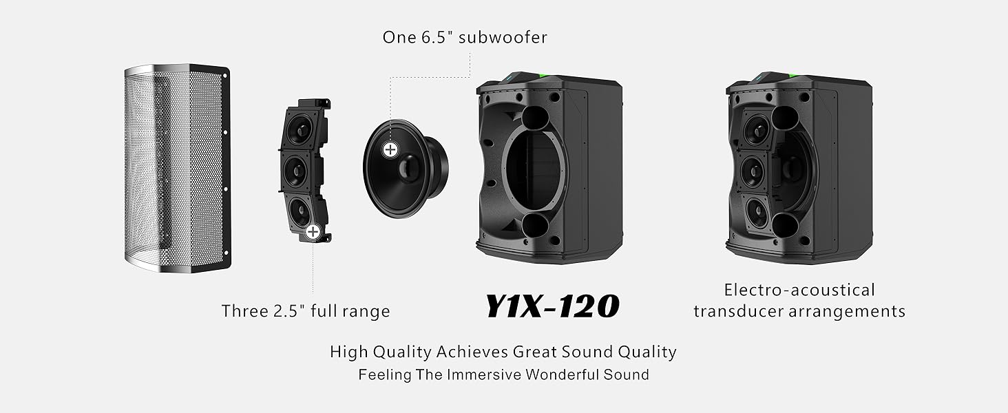 The LOTAWAY Y1X-120: 6.5" subwoofer (deep lows), 3x2.5" full-range drivers (clear mids/highs), and optimized electro-acoustical transducers. High-quality components deliver studio-grade immersion—rich, powerful audio fills any space.